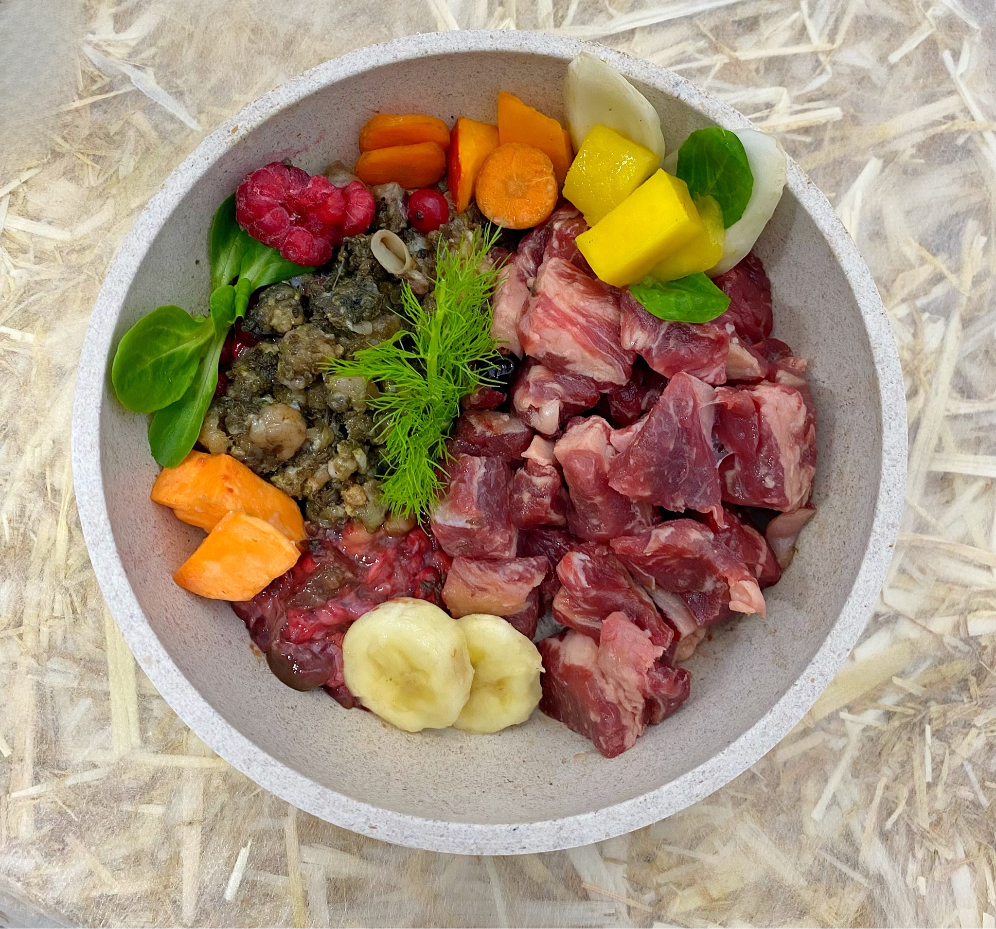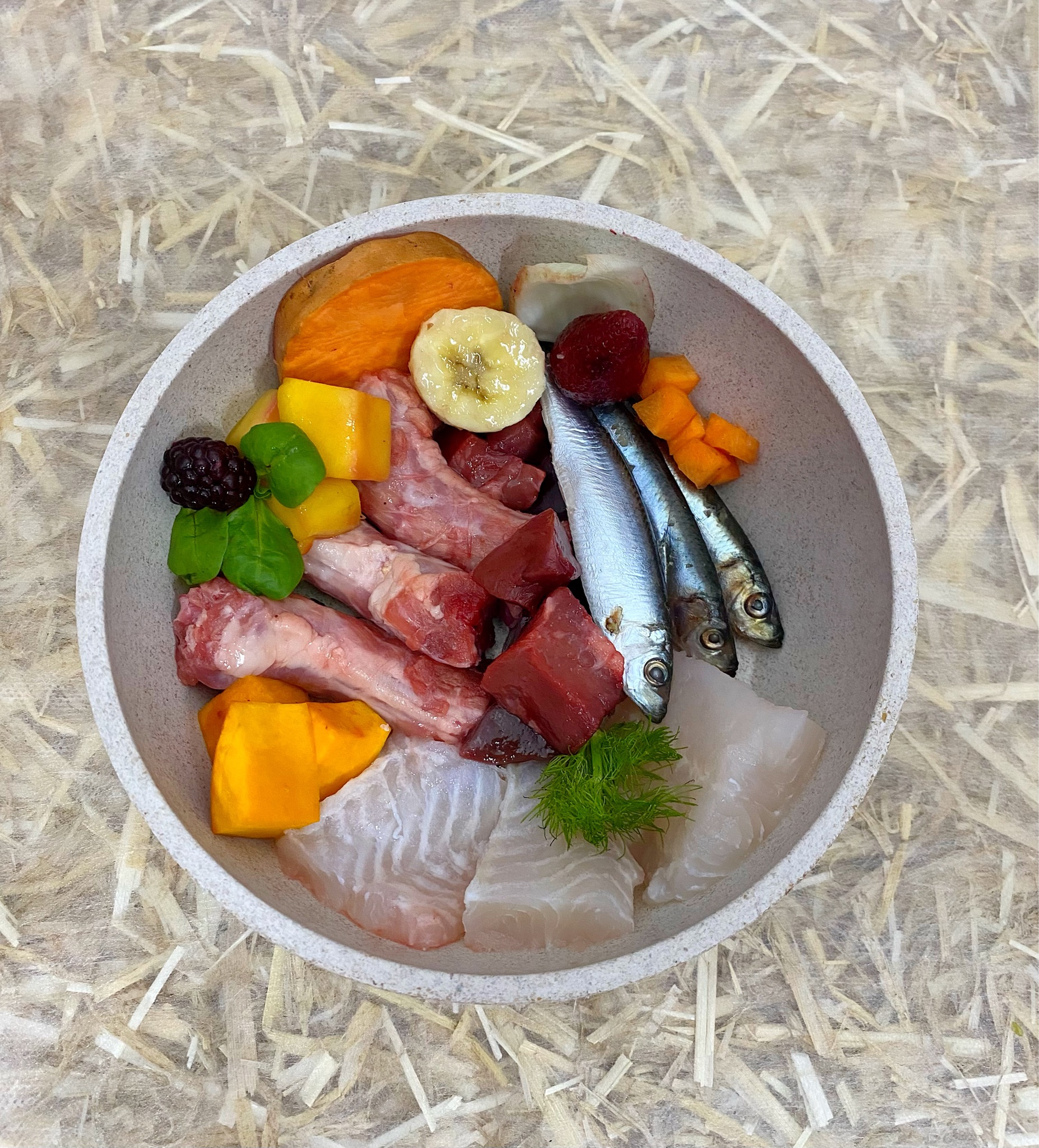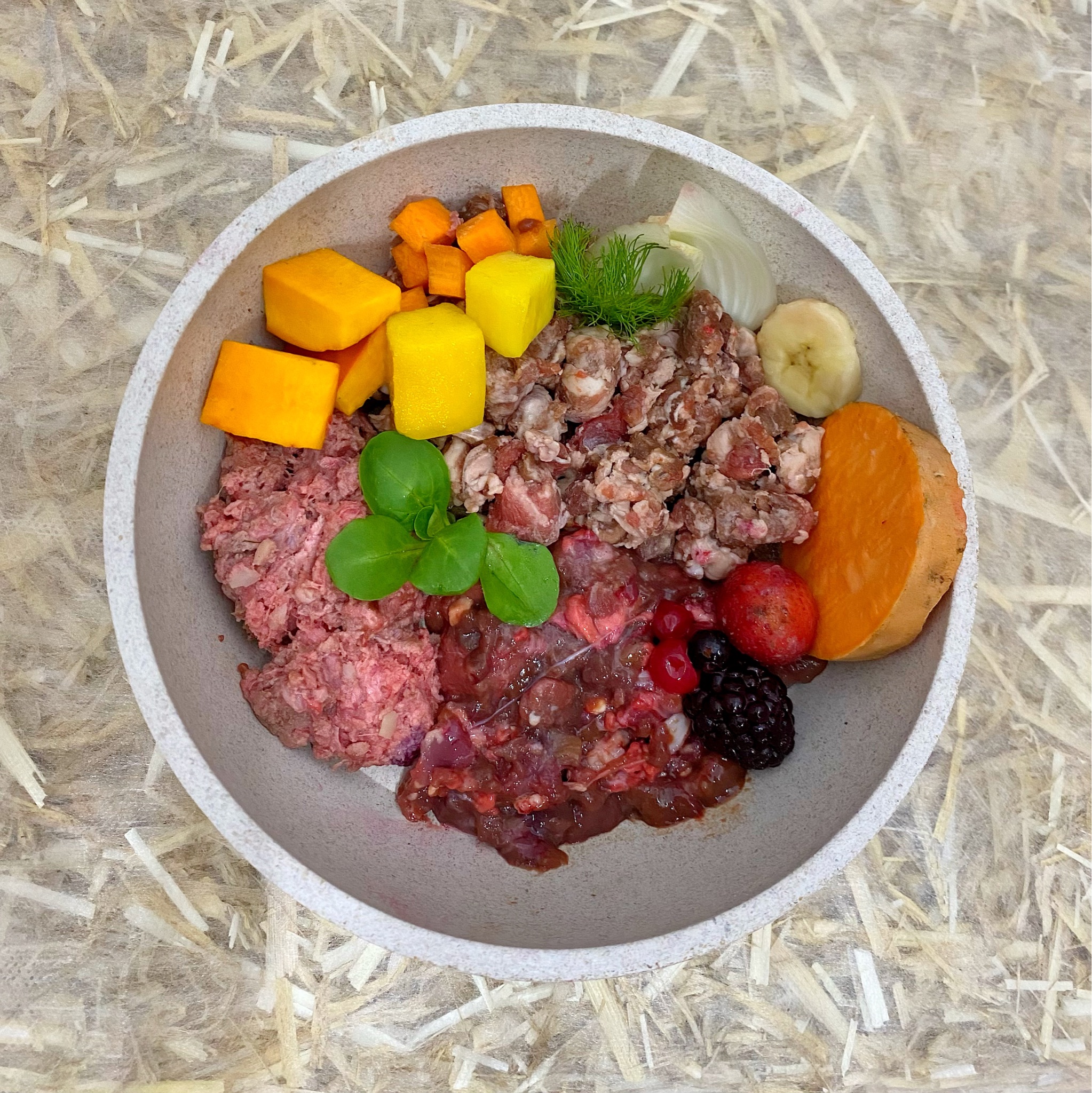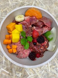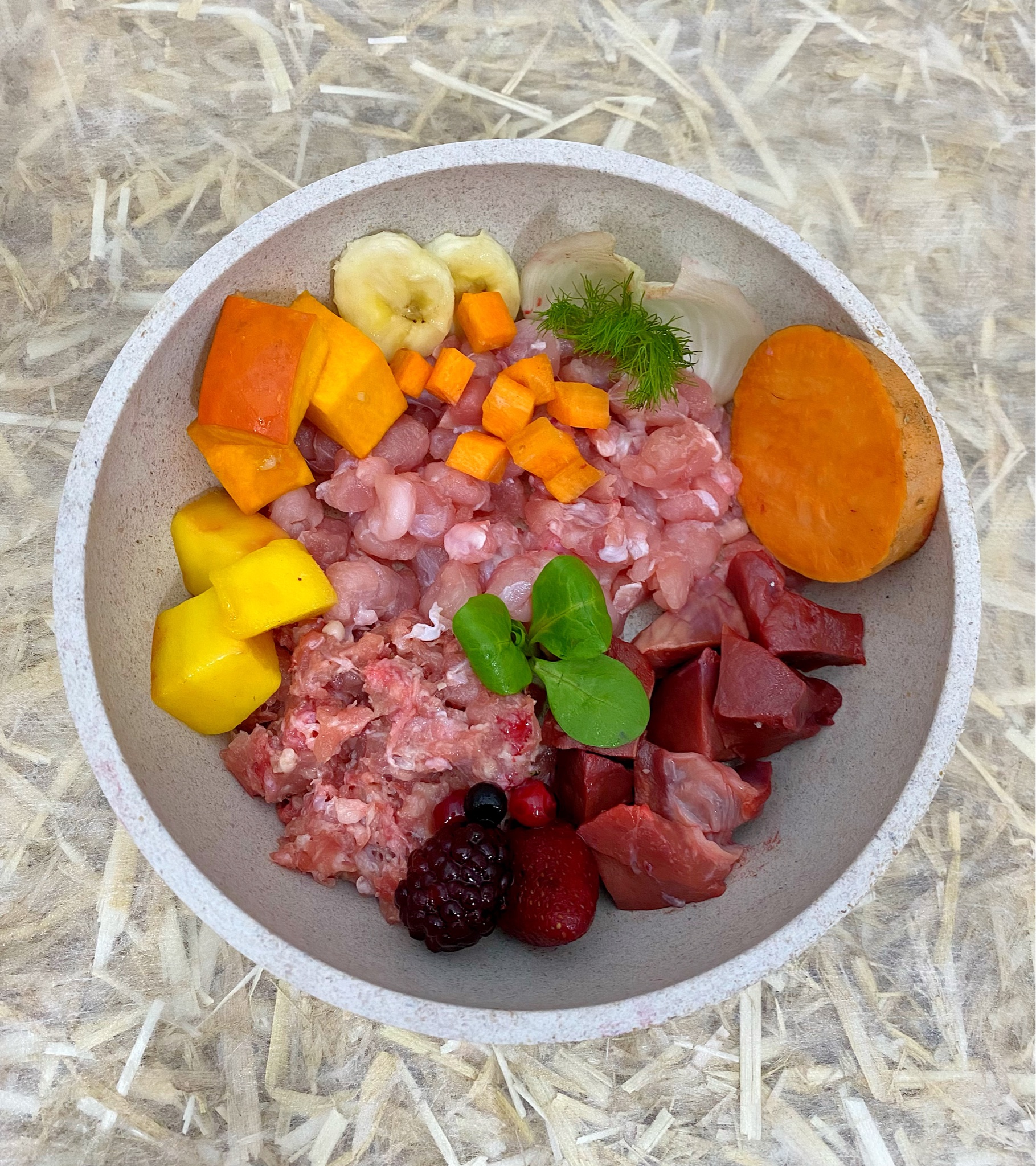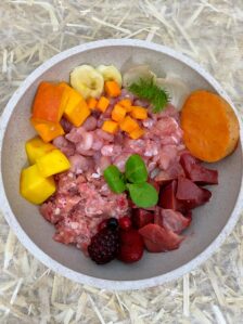 Fisch & Huhn in kleinen Stücken & Obst- und Gemüsemix GRÜN