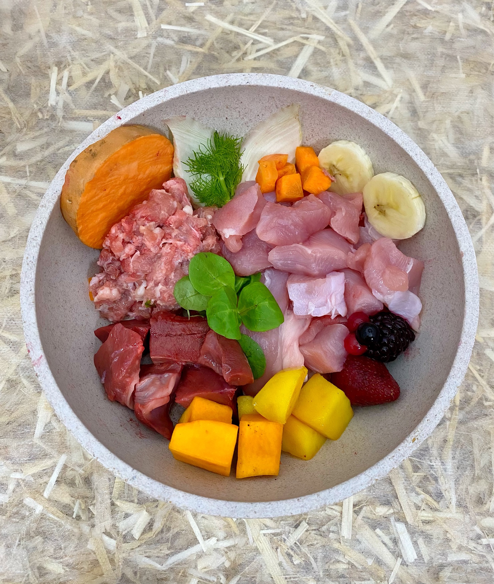 Pute in kleinen Stücken & Obst- & Gemüsemix ROT